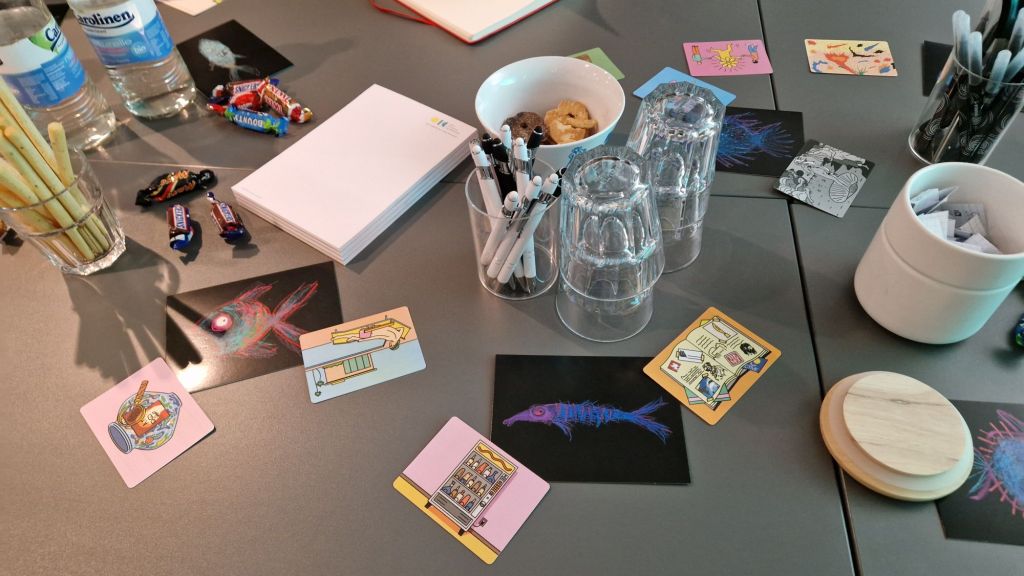 Mit diversen kreativen Schreibmethoden leitete Henrik Remmert, Coach für Social Innovation, Berufsorientierung und Future of Work, uns durch die zwei Stunden des Workshops. Als Impulsgeber lagen diverse Bilderkarten und Zettel mit Begriffen bereit. Für mich war die Schreibwerkstatt vor allem spannend, weil sie mir einen neuen Zugang zum utopischen Erzählen beschert hat. In meinem Blog habe ich bisher Bücher besprochen, Interviews geführt und Konzepte rund um Zukünfte aufbereitet – alles recht strukturiert und analytisch. Die kreative Herangehensweise bei der Schreibwerkstatt war eine neue Erfahrung, ähnlich wie es damals das fiktive Erzählen in der Future~Present Methode mit Tobias Leisgang für mich gewesen ist.